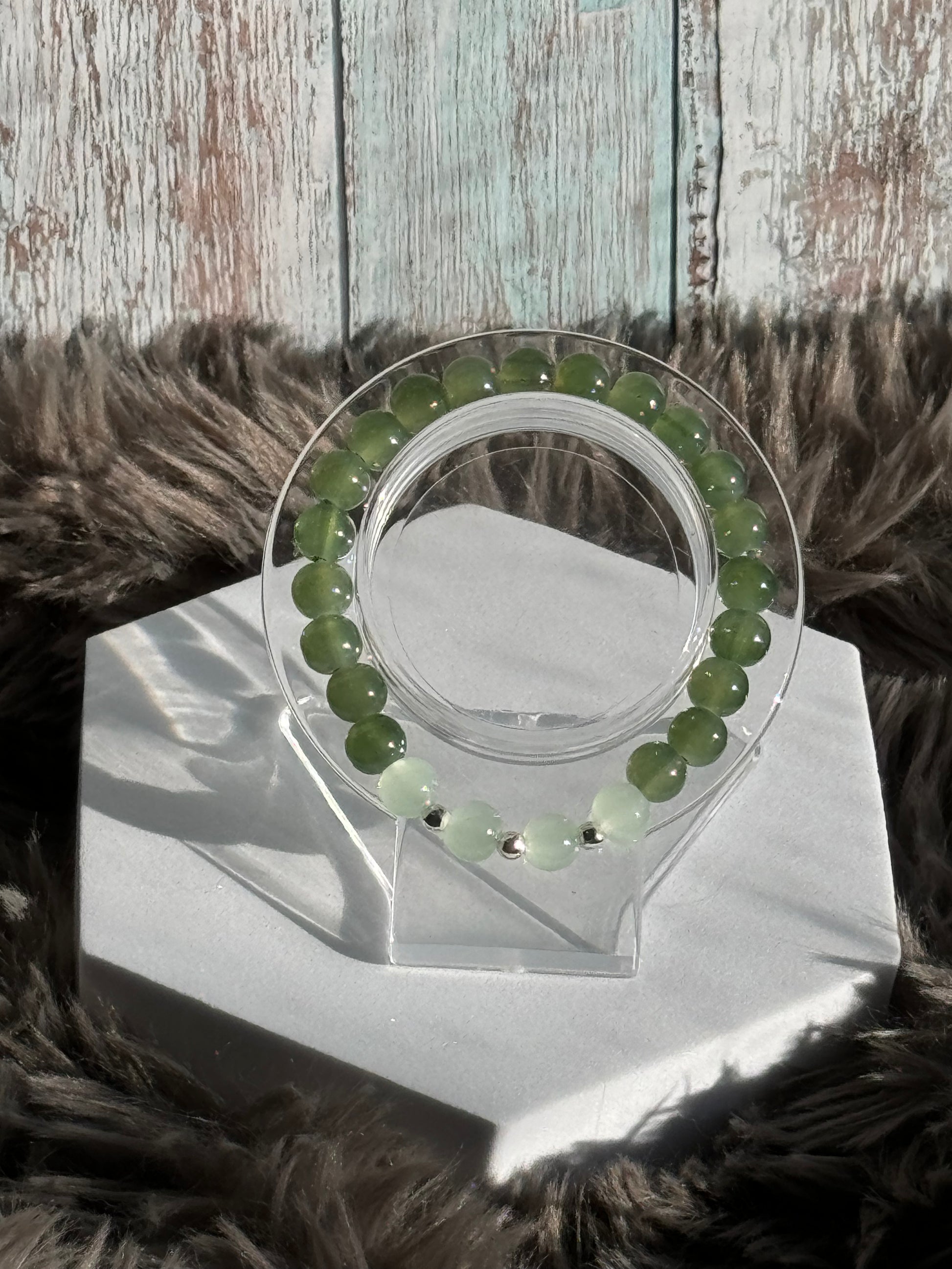 7 1/4" Mossy Green and Light Green Glass Beaded Bracelet (8mm)