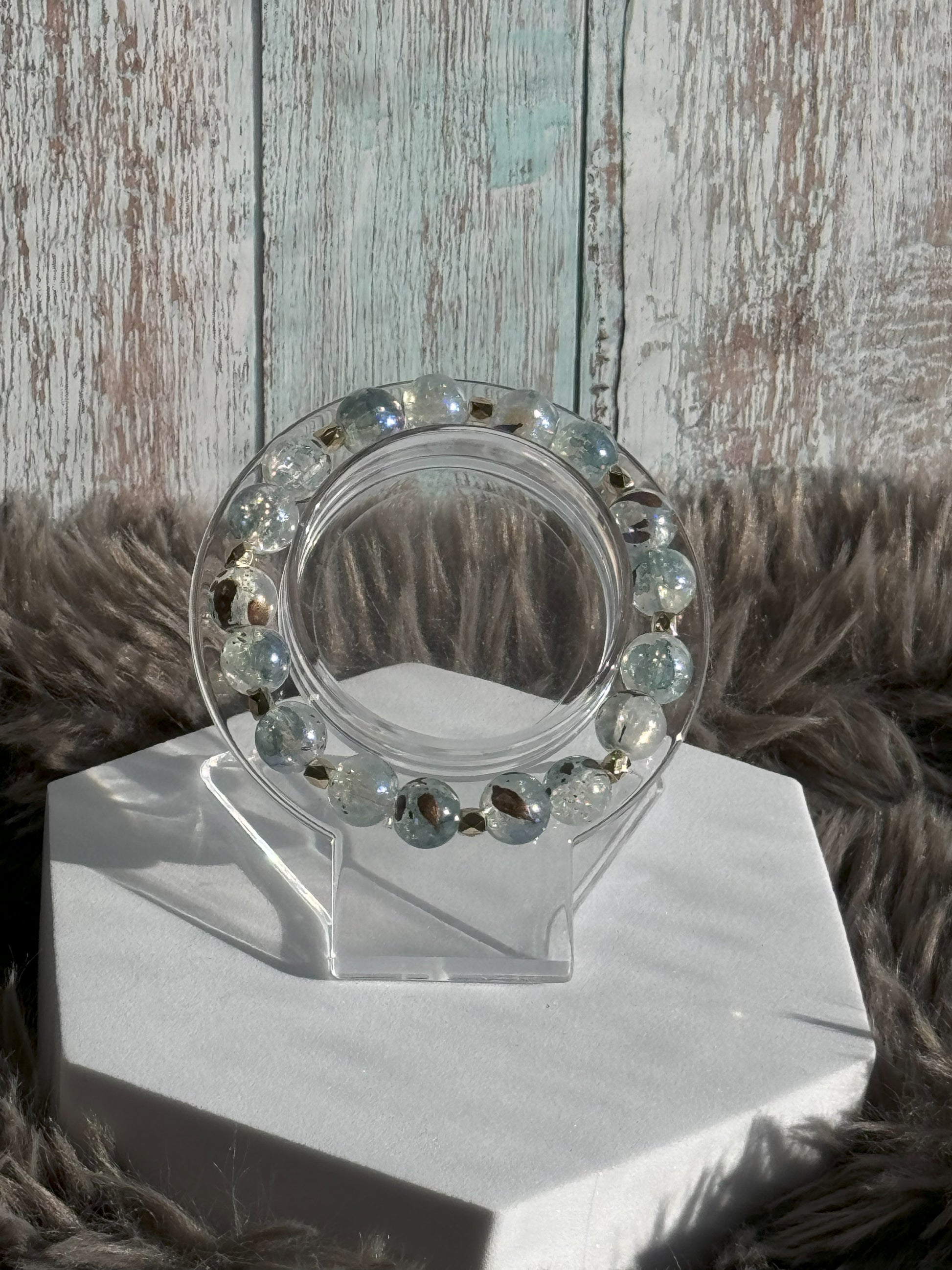 7" Blue/Clear with Bronze Splatters Glass Beaded Bracelet (10mm)